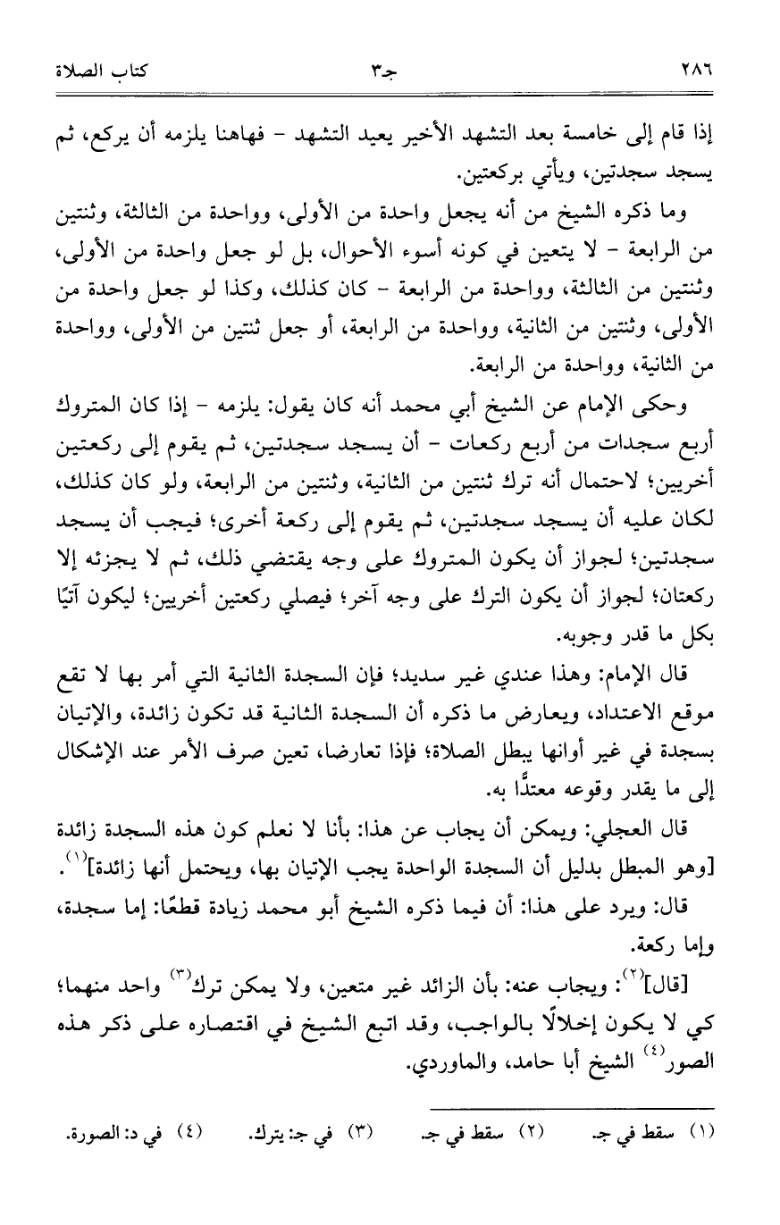 قال العجلي: ويمكن أن يجاب عن هذا: بأنا لا نعلم كون هذه السجدة زائدة [وهو المبطل بدليل أن السجدة الواحدة يجب الإتيان بها، ويحتمل أنها زائدة].
