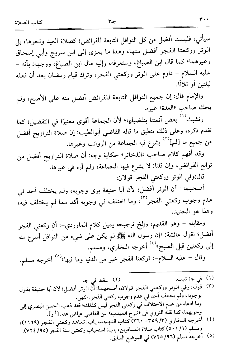 سيأتي، فليست أفضل من كل النوافل التابعة للفرائض؛ كصلاة العيد ونحوها، بل الوتر وركعتا الفجر أفضل منها، وهذا ما يعزى إلى ابن سريج وأبي إسحاق وغيرهما؛ كما قال ابن الصباغ، وستعرفه، وإليه مال ابن الصباغ، ووجهه: بأنه -عليه السلام- داوم على الوتر وركعتي الفجر، وترك قيام رمضان بعد أن فعله ليلتين أو ثلاثاً.