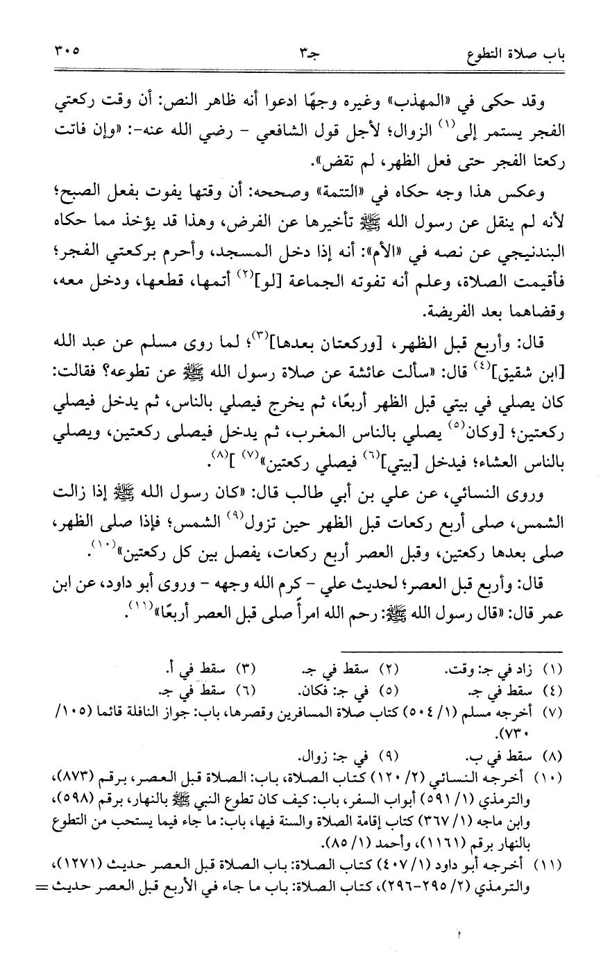 وروى النسائي، عن علي بن أبي طالب قال: "كان رسول الله صلى الله عليه وسلم إذا زالت الشمس، صلى أربع ركعات قبل الظهر حين تزول الشمس؛ فإذا صلى الظهر، صلى بعدها ركعتين، وقبل العصر أربع ركعات، يفصل بين كل ركعتين".