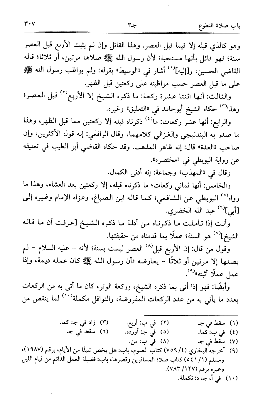 والرابع: أنها عشر ركعات: ما ذكرناه قبله إلى ركعتين مما قبل الظهر، وهذا ما صدر به البندنيجي والغزالي كلامهما، وقال الرافعي: إنه قول الأكثرين، وإن صاحب "العدة" قال: إنه ظاهر المذهب. وقد حكاه القاضي أبو الطيب في تعليقه عن رواية البويطي في "مختصره".