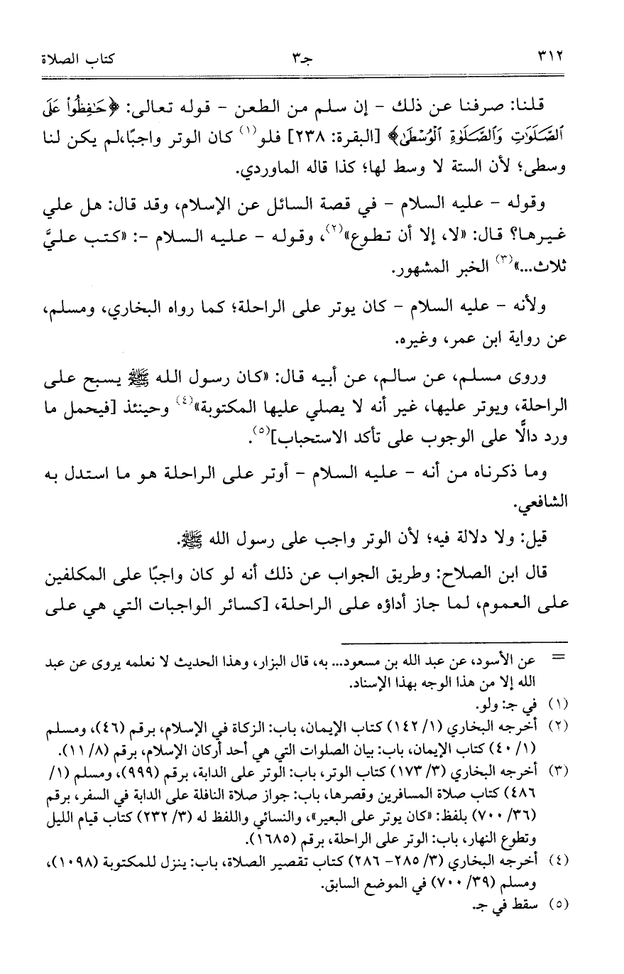 قلنا: صرفنا عن ذلك-إن سلم من الطعن- قوله تعالى: {حَافِظُوا عَلَى الصَّلَوَاتِ وَالصَّلاةِ الْوُسْطَى} [البقرة: 238] فلو كان الوتر واجباً، لم يكن لنا وسطى؛ لأن الستة لا وسط لها؛ كذا قاله الماوردي.