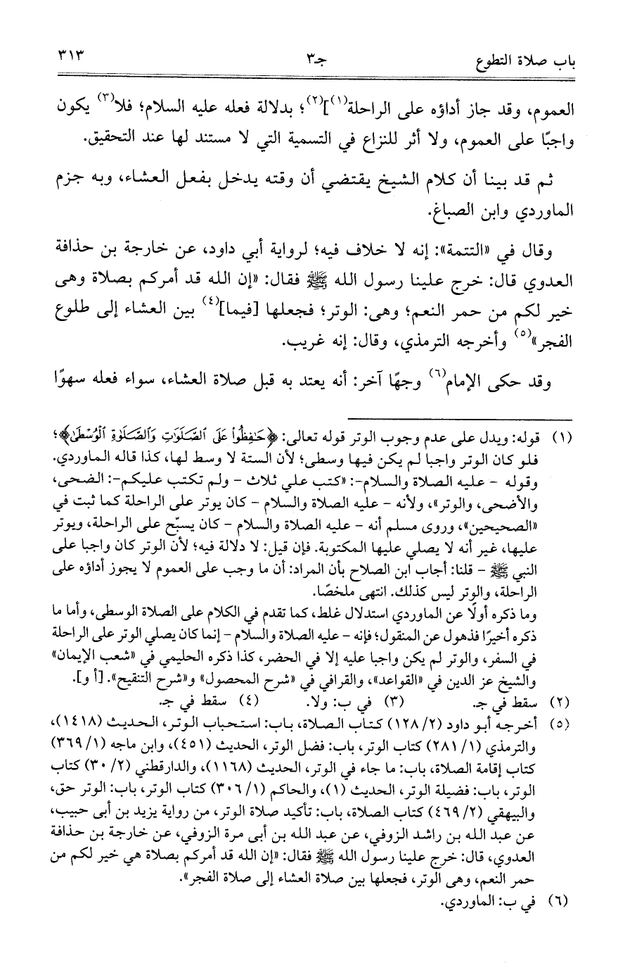 وقال في "التتمة": إنه لا خلاف فيه؛ لرواية أبي داود، عن خارجة بن حذافة العدوي قال: خرج علينا رسول الله صلى الله عليه وسلم فقال: "إن الله قد أمركم بصلاة وهي خير لكم من حمر النعم؛ وهي: الوتر؛ فجعلها [فيما] بين العشاء إلى طلوع الفجر" وأخرجه الترمذي، وقال: إنه غريب.