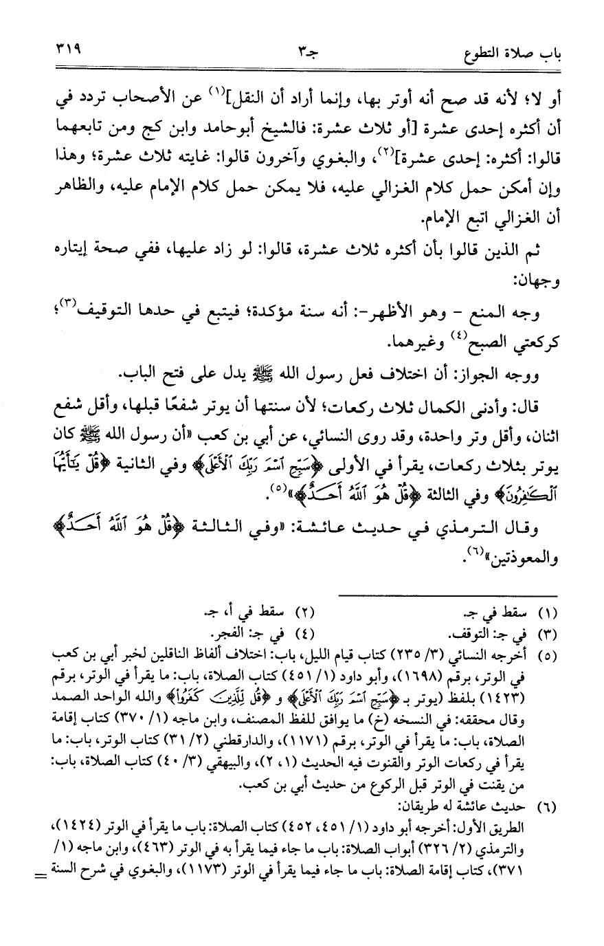 أو لا؛ لأنه قد صح أنه أوتر بها، وإنما أراد أن النقل] عن الأصحاب تردد في أن أكثره إحدى عشرة [أو ثلاث عشرة: فالشيخ أبو حامد وابن كج ومن تابعهما قالوا: أكثره: إحدى عشرة]، والبغوي وآخرون قالوا: غايته ثلاث عشرة؛ وهذا وإن أمكن حمل كلام الغزالي عليه، فلا يمكن حمل كلام الإمام عليه، والظاهر أن الغزالي اتبع الإمام.