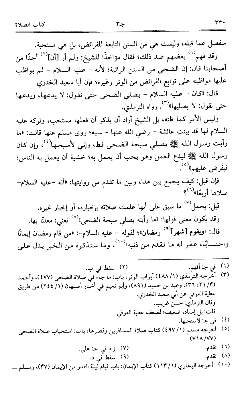 وقد فهم بعضهم ضد ذلك؛ فقال مؤاخذاً للشيخ: ولم أر [أن] أحداً من أصحابنا قال: إن الضحى من السنن الراتبة؛ لأنه -عليه السلام- لم يواظب عليها مواظبته على توابع الفرائض من الوتر وغيره؛ فإن أبا سعيد الخدري.