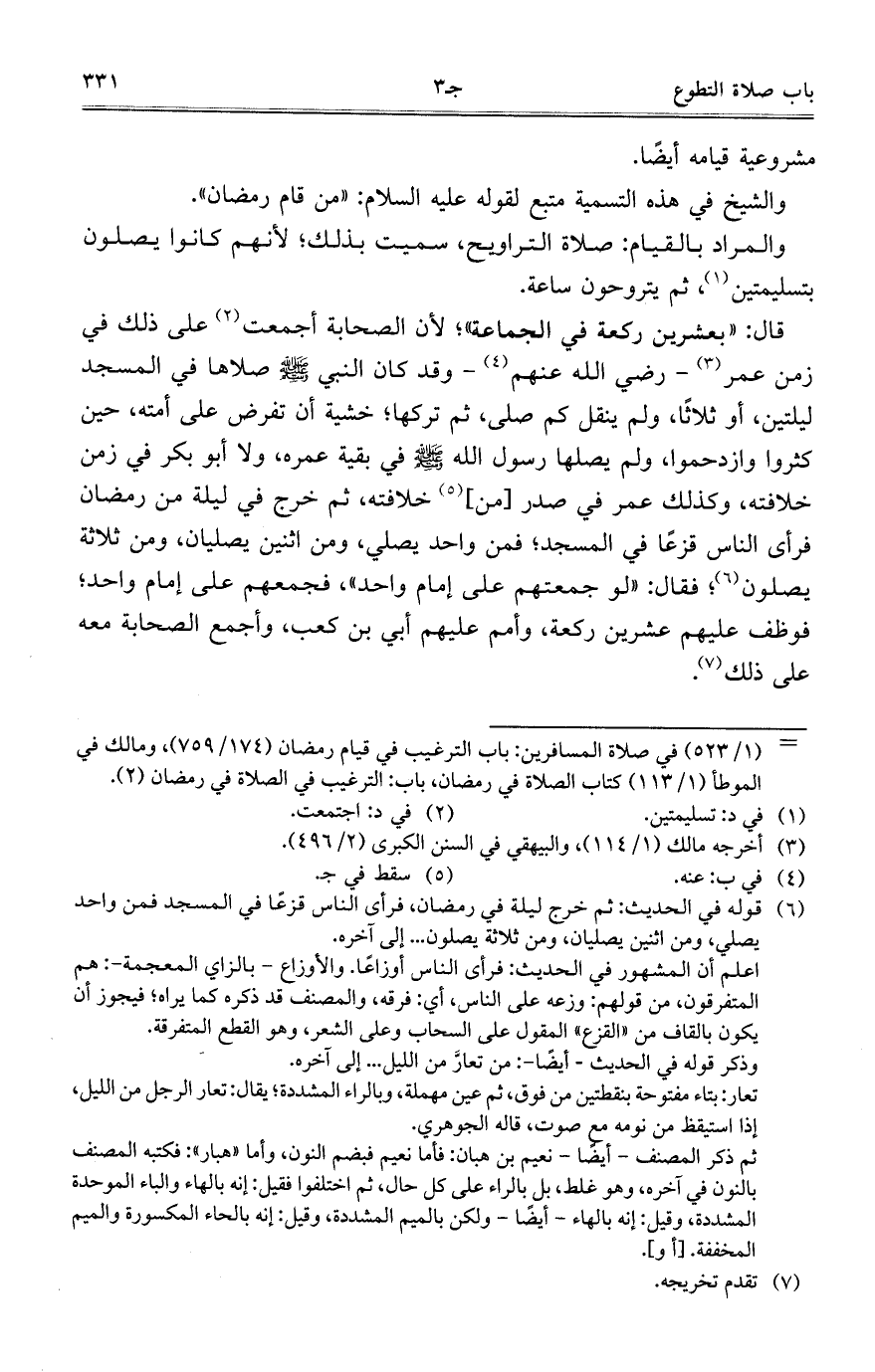 قال: "بعشرين ركعة في الجماعة"؛ لأن الصحابة أجمعت على ذلك في زمن عمر -رضي الله عنهم- وقد كان النبي صلى الله عليه وسلم صلاها في المسجد ليلتين، أو ثلاثاً، ولم ينقل كم صلى، ثم تركها؛ خشية أن تفرض على أمته، حين كثروا وازدحموا، ولم يصلها رسول الله صلى الله عليه وسلم في بقية عمره، ولا أبو بكر في زمن خلافته، وكذلك عمر في صدر [من] خلافته، ثم خرج في ليلة من رمضان فرأى الناس قزعاً في المسجد؛ فمن واحد يصلي، ومن اثنين يصليان، ومن ثلاثة يصلون؛ فقال: "لو جمعتهم على إمام واحد"، فجمعهم على إمام واحد؛ فوظف عليهم عشرين ركعة، وأمم عليهم أبي بن كعب، وأجمع الصحابة معه على ذلك.