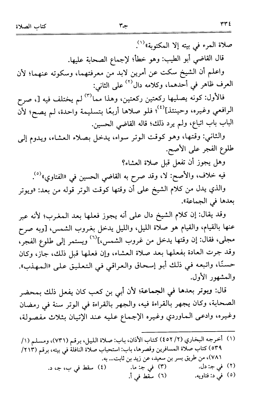 قال: ووتر بعدها في الجماعة؛ لأن أبي بن كعب كان يفعل ذلك بمحضر الصحابة، وكان يجهر بالقراءة فيه، والجهر بالقراءة في الوتر سنة في رمضان وغيره، وادعى الماوردي وغيره الإجماع عليه عند الإتيان بثلاث مفصولة،