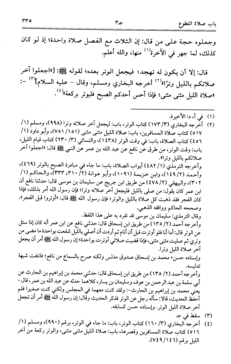 وجعلوه حجة على من قال: إن الثلاث مع الفصل صلاة واحدة؛ إذ لو كان كذلك، لما جره في الآخرة منها، والله أعلم.