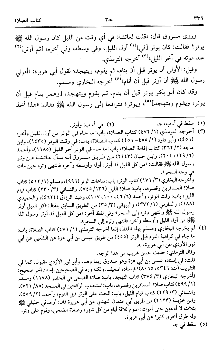 وروى مسروق قال: "قلت لعائشة: في أي وقت من الليل كان رسول الله صلى الله عليه وسلم يوتر؟ فقالت: كان يوتر [في] أول الليل، وفي وسطه، وفي آخره، [ثم أوتر] عند موته في آخر الليل" أخرجه الترمذي.