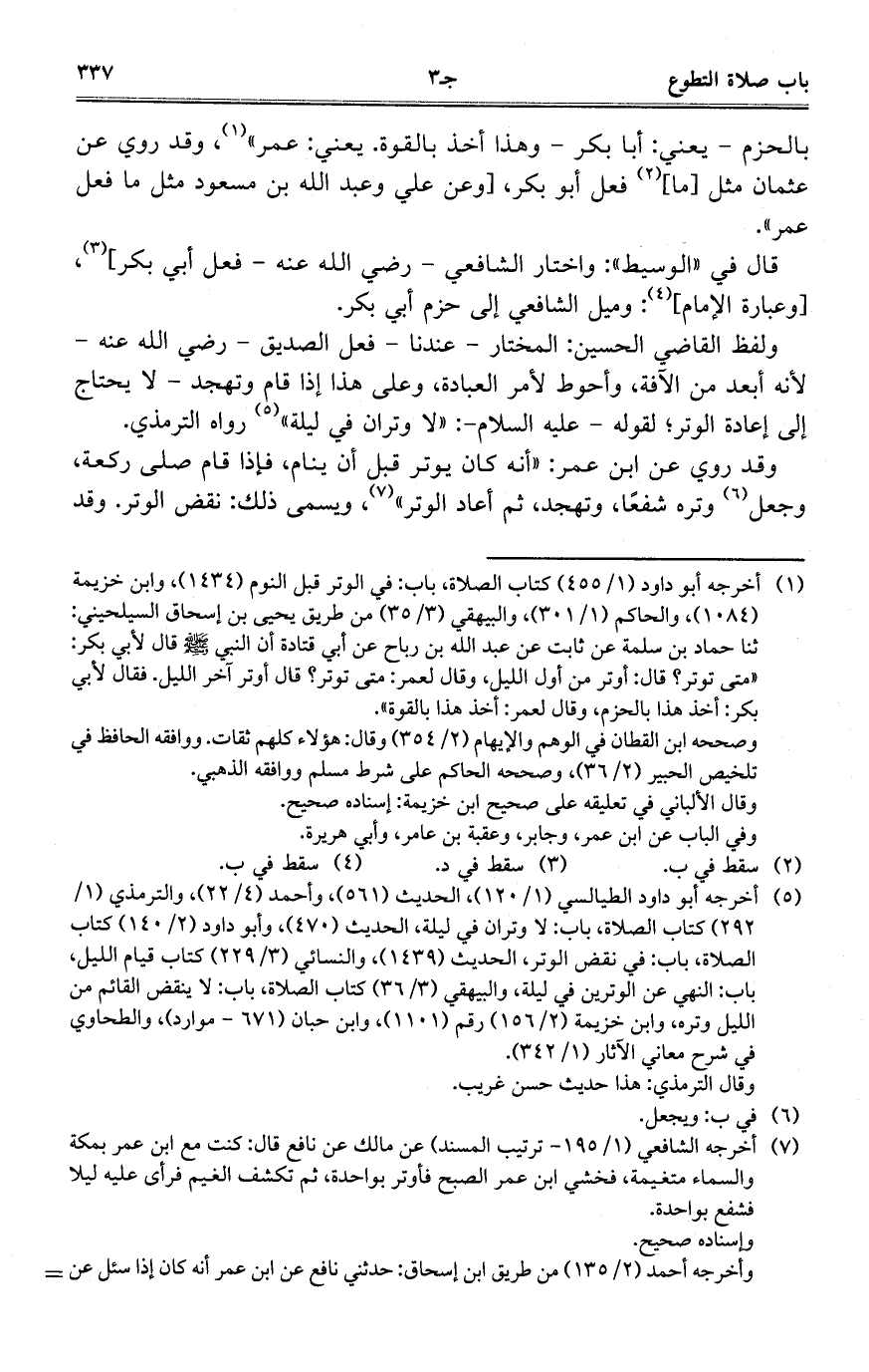 ولفظ القاضي الحسين: المختار -عندنا- فعل الصديق- رضي الله عنه- لأنه أبعد من الآفة، وأحوط لأمر العبادة، وعلى هذا إذا قام وتهجد -لا يحتاج إلى إعادة الوتر؛ لقوله -عليه السلام-:"ولا وتران في ليلة" رواه الترمذي.