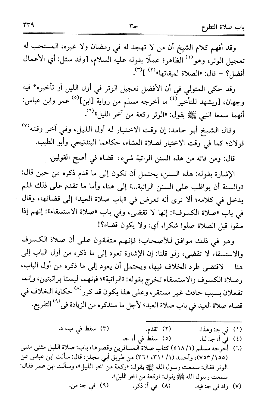وقد حكى المتولي في أن الأفضل تعجيل الوتر في أول الليل أو تأخيره؟ فيه وجهان، [ويشهد للتأخير ما أخرجه مسلم من رواية [ابن] عمر وابن عباس: أنهما سعا النبي صلى الله عليه وسلم يقول: "الوتر ركعة من آخر الليل".