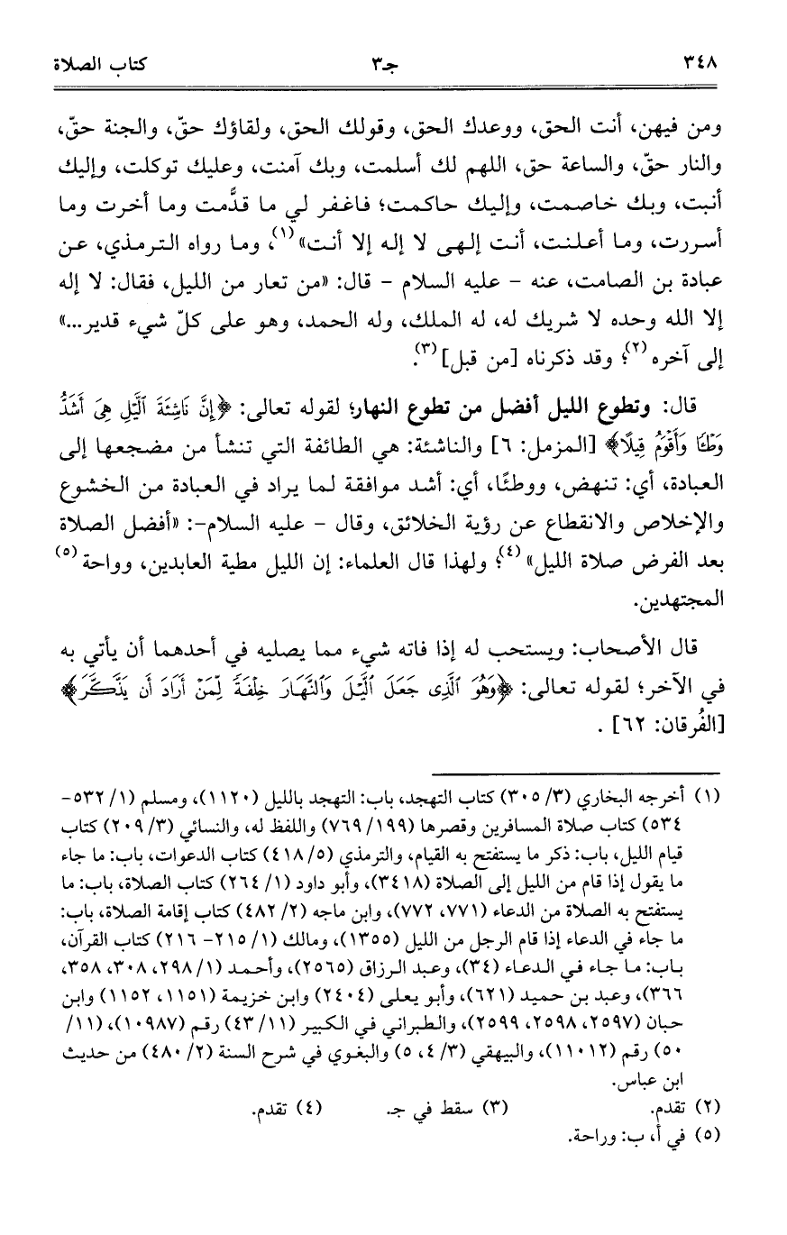 ومن فيهن، أنت الحق، ووعدك الحق، وقولك الحق، ولقاؤك حق، والجنة حق، والنار حق، والساعة حق، اللهم لك أسلمت، وبك آمنت، وعليك توكلت، وإليك أنبت، وبك خاصمت، وإليك حاكمت؛ فاغفر لي ما قدمت وما أخرت وما أسررت، وما أعلنت، أنت إلهي لا إله إلا أنت"، وما رواه الترمذي، عن عبادة بن الصامت، عنه-عليه السلام- قال: "من تعار من الليل، فقال: لا إله إلا الله وحده لا شريك له، له الملك، وله الحمد، وهو على كل شيء قدير ... " إلى آخره؛ وقد ذكرناه [من قبل].