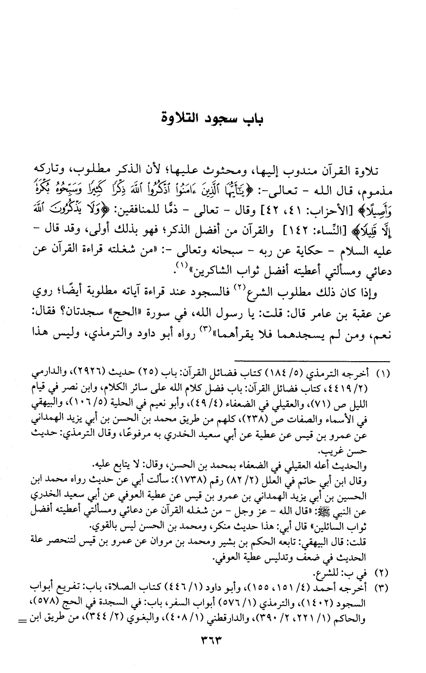 وإذا كان ذلك مطلوب الشرع فالسجود عند قراءة آياته مطلوبة أيضاً؛ روي عن عقبة بن عامر قال: قلت: يا رسول الله، في سورة "الحج" سجدتان؟ فقال: نعم، ومن لم يسجدهما فلا يقرأهما" رواه أبو داود والترمذي، وليس هذا