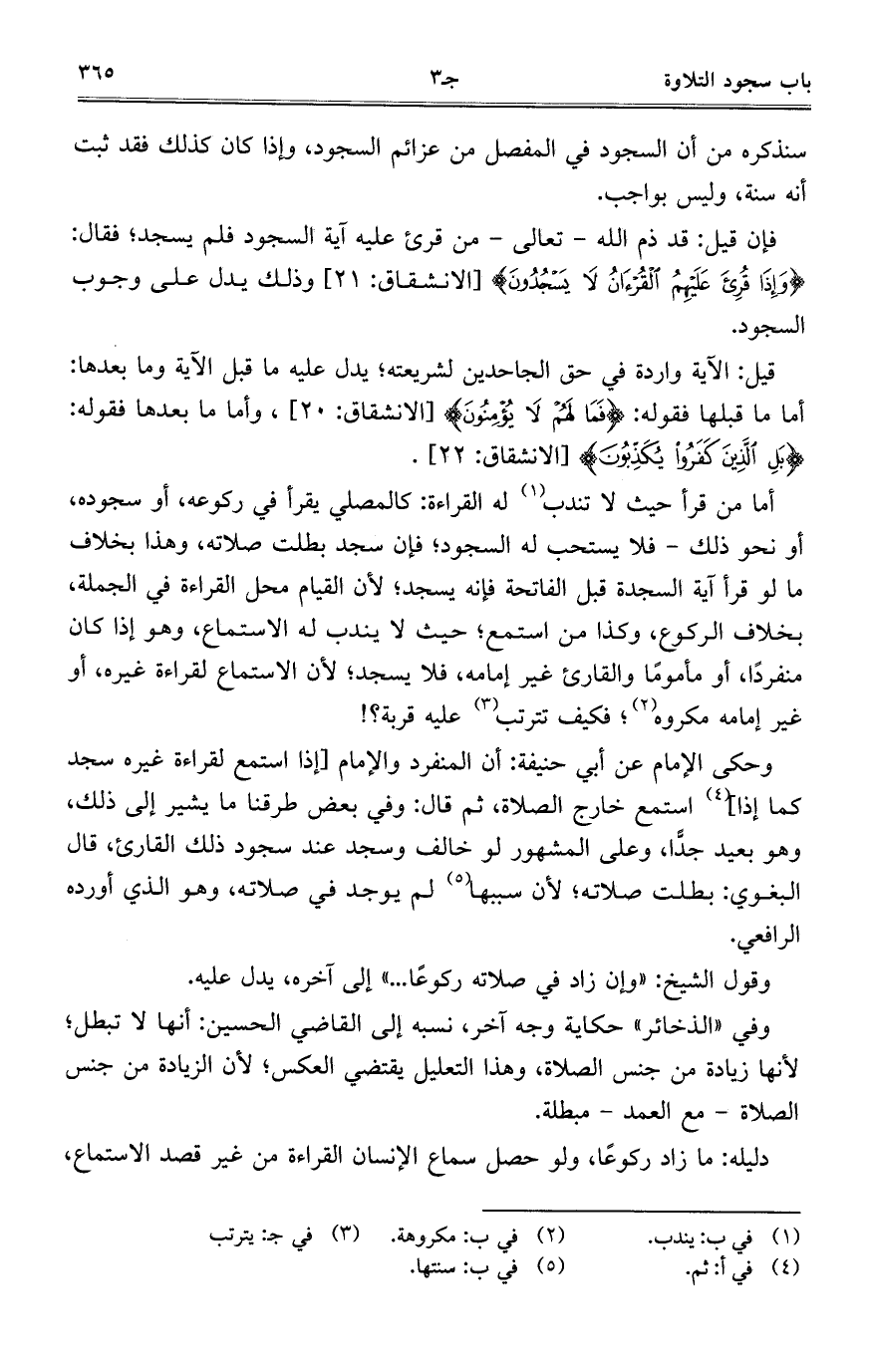أما من قرأ حيث لا تندب له القراءة: كالمصلي يقرأ في ركوعه، أو سجوده، أو نحو ذلك-فلا يستحب له السجود؛ فإن سجد بطلت صلاته، وهذا بخلاف ما لو قرأ آية السجدة قبل الفاتحة فإنه يسجد؛ لأن القيام محل القراءة في الجملة، بخلاف الركوع، وكذا مناستمع؛ حيث لا يندب له الاستماع، وهو إذا كان منفرداً، أو مأموماً والقارئ غير إمامه، فلا يسجد؛ لأن الاستماع لقراءة غيره، أو غير إمامه مكروه؛ فكيف تترتب عليه قربة؟!
