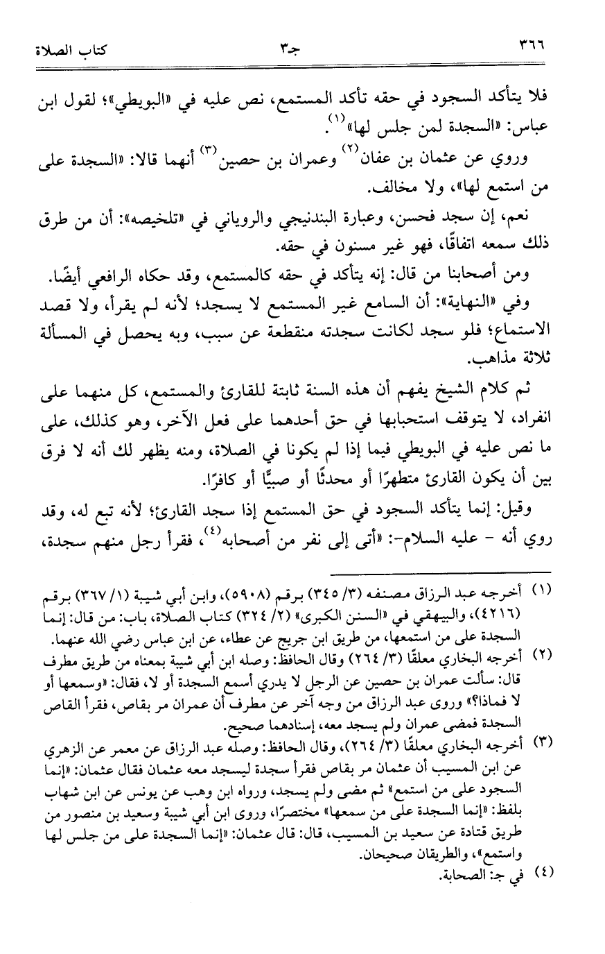 وروي عن عثمان بن عفان وعمران بن حصين أنهما قالا: "السجدة على من استمع لها"، ولا مخالف.