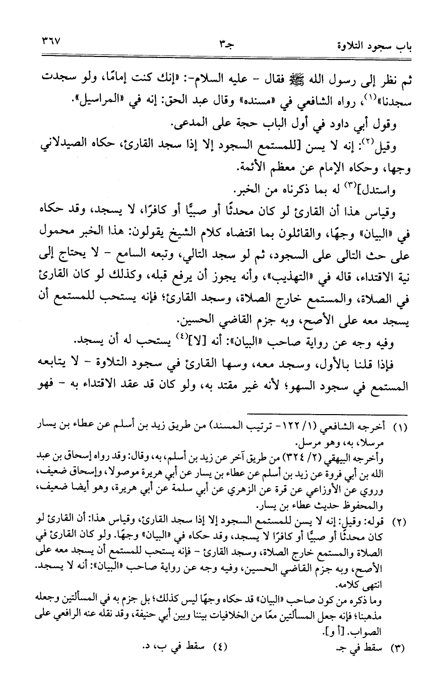 ثم نظر إلى رسول الله صلى الله عليه وسلم فقال -عليه السلام-: "إنك كنت إماماً، ولو سجدت سجدنا"، رواه الشافعي في "مسنده" وقال عبد الحق: إنه في "المراسيل".