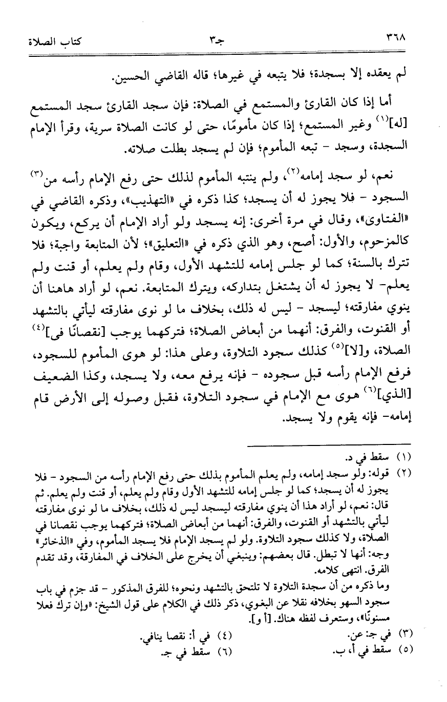 نعم، لو سجد إمامه، ولم ينتبه المأموم لذلك حتى رفع الإمام رأسه من السجود-فلا يجوز له أن يسجد؛ كذا ذكره في "التهذيب"، وذكره القاضي في "الفتاوى"، وقال في مرة أخرى: إنه يسجد ولو أراد الإمام أن يركع، ويكون كالمزحوم، والأول: أصح، وهو الذي ذكره في "التعليق"؛ لأن المتابعة واجبة؛ فلا تترك بالسنة؛ كما لو جلس إمامه للتشهد الأول، وقام ولم يعلم، أو قنت ولم يعلم- لا يجوز له أن يشتغل بتداركه، ويترك المتابعة. نعم، لو أراد هاهنا أن ينوي مفارقته؛ ليسجد-ليس له ذلك، بخلاف ما لو نوى مفارقته ليأتي بالتشهد أو القنوت، والفرق: أنهما من أبعاض الصلاة؛ فتركهما يوجب [نقصاناً في] الصلاة، و [لا] كذلك سجود التلاوة، وعلى هذا: لو هوى المأموم للسجود، فرفع الإمام رأسه قبل سجوده- فإنه يرفع معه، ولا يسجد، وكذا الضعيف [الذي] هوى مع الإمام في سجود التلاوة، فقبل وصوله إلى الأرض قام إمامه- فإنه يقوم ولا يسجد.