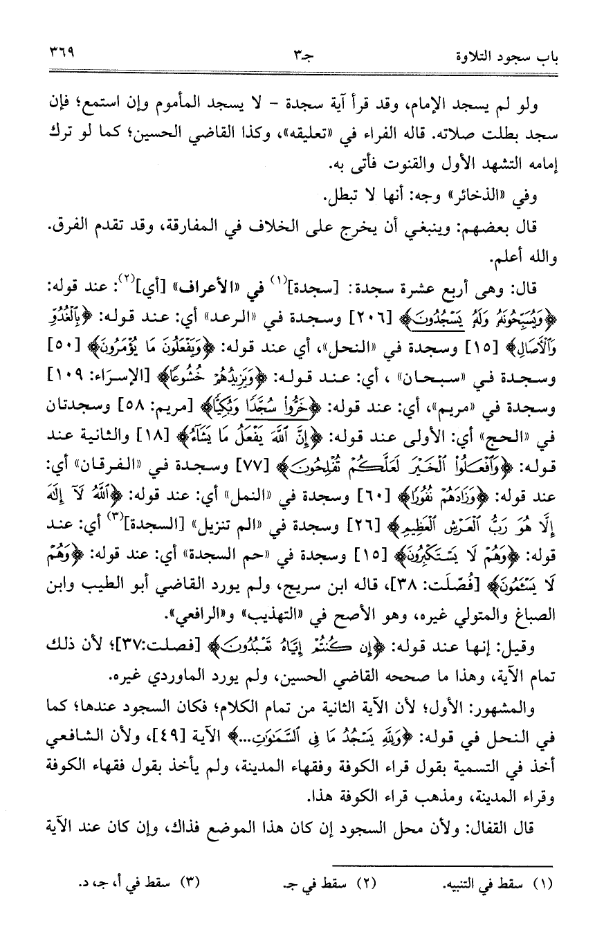 والمشهور: الأول؛ لأن الآية الثانية من تمام الكلام؛ فكان السجود عندها؛ كما في النحل في قوله: {وَلِلَّهِ يَسْجُدُ مَا فِي السَّمَوَاتِ ...} الآية [49]، ولأن الشافعي أخذ في التسمية بقول قراء الكوفة وفقهاء المدينة، ولم يأخذ بقول فقهاء الكوفة وقراء المدينة، ومذهب قراء الكوفة هذا.