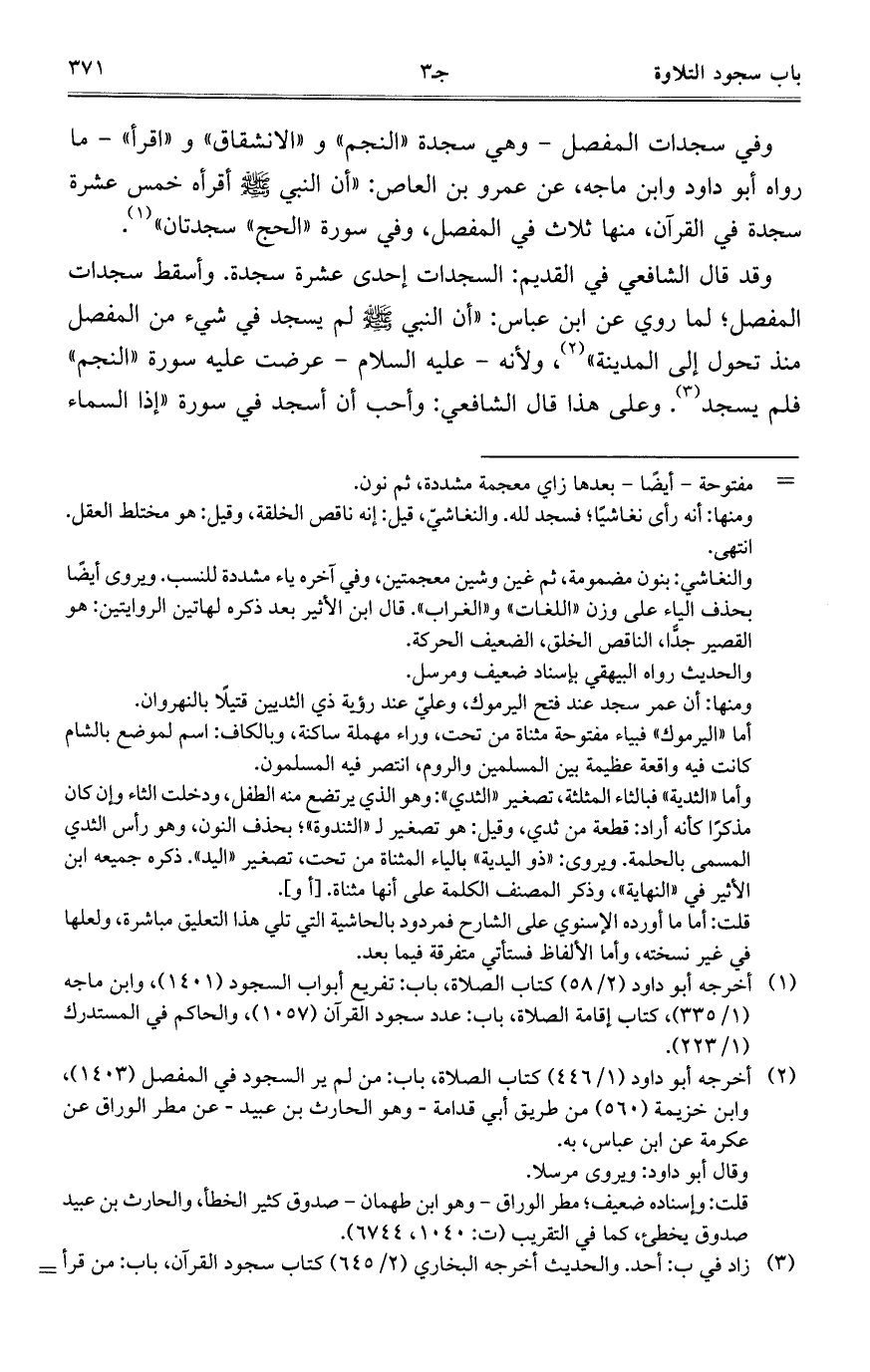 وفي سجدات المفصل- وهي سجدة "النجم" و"الانشقاق" و"اقرأ" – ما رواه أبو داود وابن ماجه، عن عمرو بن العاص: "أن النبي صلى الله عليه وسلم أقرأه خمس عشرة سجدة في القرآن، منها ثلاث في المفصل، وفي سورة "الحج" سجدتان".