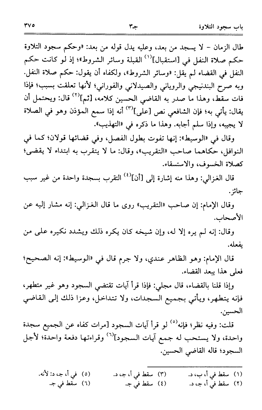 طال الزمان-لا يسجد من بعد، وعليه يدل قوله من بعد: "وحكم سجود التلاوة حكم صلاة النفل في [استقبال] القبلة وسائر الشروط"؛ إذ لو كانت حكم النفل في القضاء لم يقل: "وسائر الشروط"، ولكفاه أن يقول: حكم صلاة النفل. وبه صرح البندنيجيوالروياني والصيدلاني والفوراني؛ لأنها تعلقت بسبب؛ فإذا فات سقط، وهذا ما صدر به القاضي الحسين كلامه، [ثم] قال: ويحتمل أن يقال: يأتي به فإن الشافعي نص [على] أنه إذا سمع المؤذن وهو في الصلاة لا يجيبه، وإذا سلم أجابه، وهذا ما ذكره في "التهذيب".