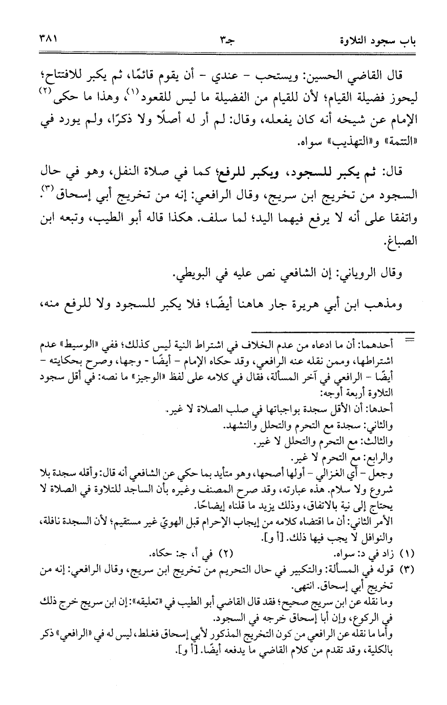 قال: ثم يكبر للسجود، ويكبر للرفع؛ كما في صلاة النفل، وهو في حال السجود من تخريج ابن سريج، وقال الرافعي: إنه من تخريج أبي إسحاق. واتفقا على أنه لا يرفع فيهما اليد؛ لما سلف. هكذا قاله أبو الطيب، وتبعه ابن الصباغ.