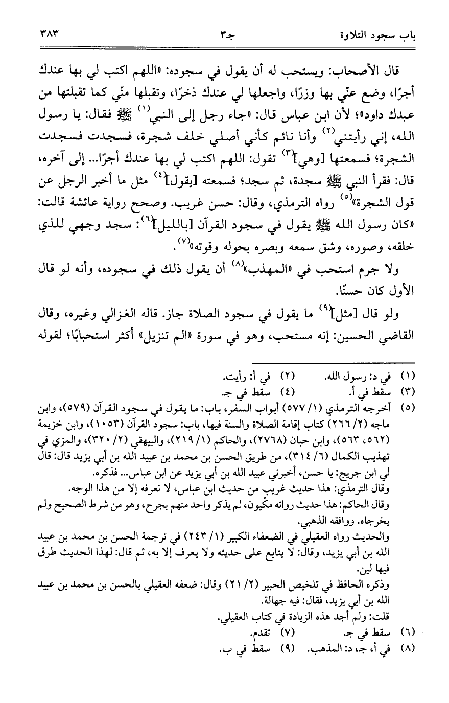 قال الأصحاب: ويستحب له أن يقول في سجوده: "اللهم اكتب لي بها عندك أجراً، وضع عنّي بها وزراً، واجعلها لي عندك ذخراً، وتقبلها مني كما تقبلتها من عبدك داود"؛ لأن ابن عباس قال: "جاء رجل إلى النبي صلى الله عليه وسلم فقال: يا رسول الله، إني رأيتني وأنا نائم كأني أصلي خلف شجرة، فسجدت فسجدت الشجرة؛ فسمعتها [وهي] تقول: اللهم اكتب لي بها عندك أجراً .. إلى آخره، قال: فقرأ النبي صلى الله عليه وسلم سجدة، ثم سجد؛ فسمعته [يقول] مثل ما أخبر الرجل عن قول الشجرة" رواه الترمذي، وقال: حسن غريب. وصحح رواية عائشة قالت: "كان رسول الله صلى الله عليه وسلم يقول في سجود القرآن [بالليل]: سجدي وجهي للذي خلقه، وصوره، وشق سمعه وبصره بحوله وقوته".