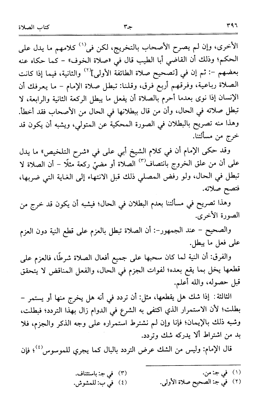 الثالثة: إذا شك هل يقطعها، مثل: أن تردد في أنه هل يخرج منها أو يستمر- بطلت؛ لأن الاستمرار الذي اكتفى به الشرع في الدوام زال بهذا التردد؛ فبطلت، وشبه ذلك بالإيمان؛ فإنا وإن لم نشترط استمراره على وجه الذكر والجزم، فلا بد من اشتراط ألا يدركه شك وتردد.