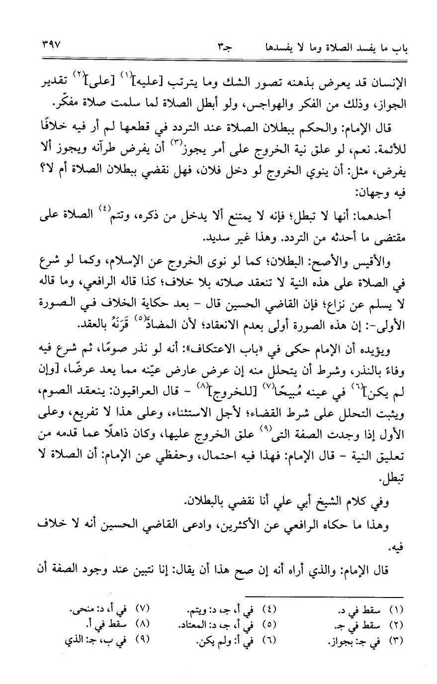 قال الإمام: والحكم ببطلان الصلاة عند التردد في قطعها لم أر فيه خلافاً للأئمة. نعم، لو علق نية الخروج علىمر يجوز أن يفرض طرآنه ويجوز ألا يفرض، مثل: أن ينوي الخروج لو دخل فلان، فهل نقضي ببطلان الصلاة أم لا؟ فيه وجهان: