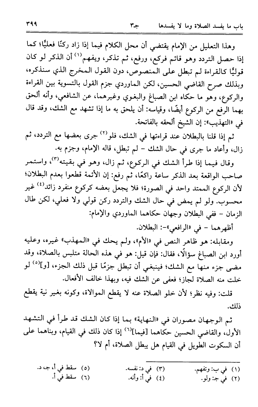 وهذا التعليل من الإمام يقتضي أن محل الكلام فيما إذا زاد ركناً فعلياً؛ كما إذا حصل التردد وهو قائم فركع، ورفع، ثم تذكر، ويفهم أن الذكر لو كان قولياً كالقراءة لم تبطل على المنصوص، دون القول المخرج الذي سنذكره، وبذلك صرح القاضي الحسين، لكن الماوردي جزم القول بالتسوية بين القراءة والركوع، وهو ما حكاه ابن الصباغ والبغوي وغيرهما، عن الشافعي، وأنه ألحق بهما الرفع من الركوع أيضاً، وقياسه: أن يلحق به ما إذا تشهد مع الشك، وقد قال في "التهذيب": إن الشيخ الحقه بالفاتحة.