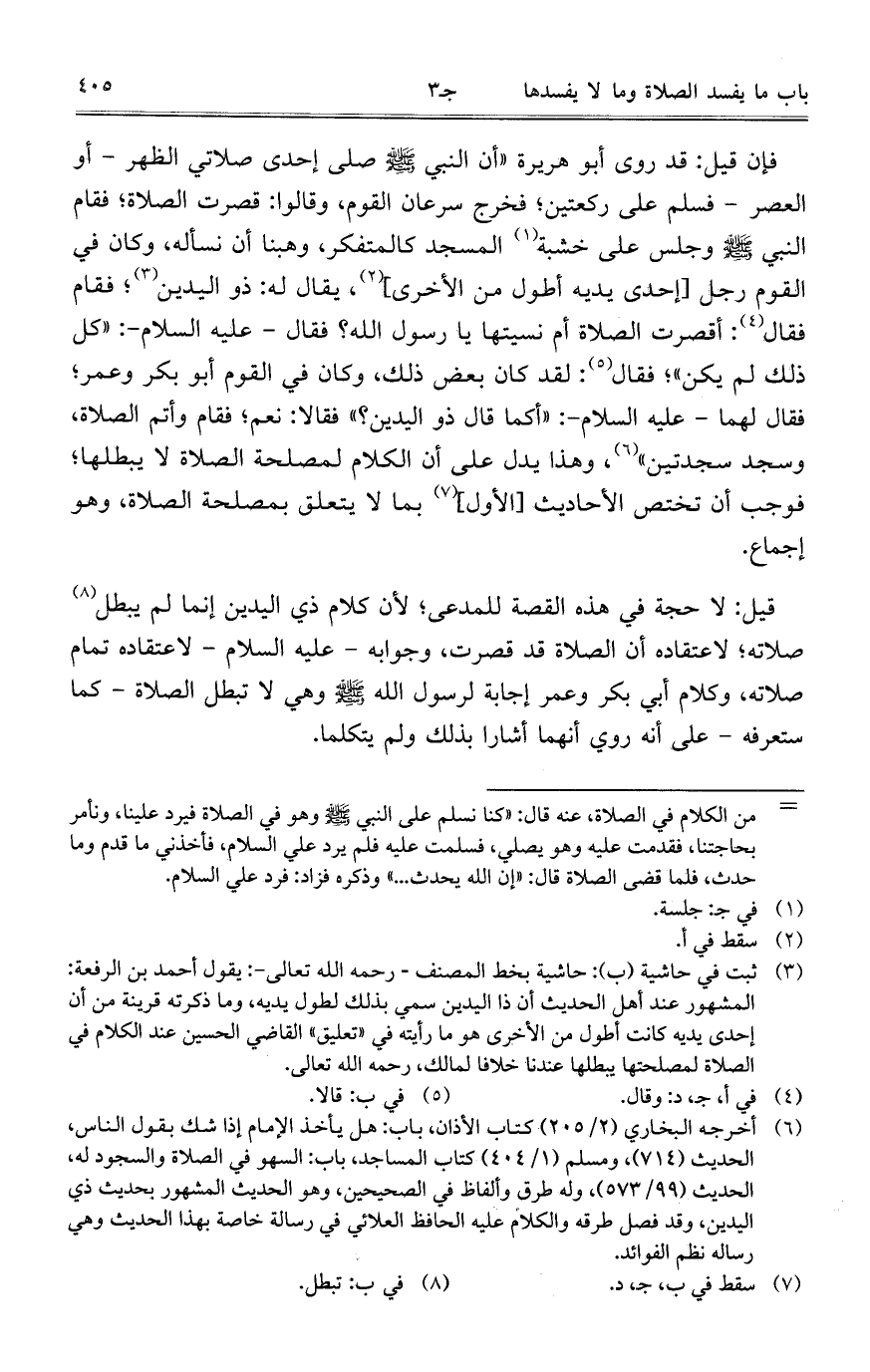 فإن قيل: قد روى أبو هريرة "أن النبي صلى الله عليه وسلم صلى إحدى صلاتي الظهر- أو العصر-فسلم على ركعتين؛ فخرج سرعان القوم، وقالوا: قصرت الصلاة؛ فقام النبي صلى الله عليه وسلم وجلس على خشبة المسجد كالمتفكر، وهبنا أن نسأله، وكان في القوم رجل [إحدى يديه أطول من الأخرى]، يقال له: ذو اليدين؛ فقام فقال: أقصرت الصلاة أم نسيتها يا رسول الله؟ فقال-عليه السلام-:"كل ذلك لم يكن"؛ فقال: لقد كان بعض ذلك، وكان في القوم أبو بكر وعمر؛ فقال لهما-عليه السلام-:"أكما قال ذو اليدين؟ " فقالا: نعم؛ فقام وأتم الصلاة، وسجد سجدتين"، وهذا يدل على أن الكلام لمصلحة الصلاة لا يبطلها؛ فوجب أن تختص الأحاديث [الأول] بما لا يتعلق بمصلحة الصلاة، وهو إجماع.