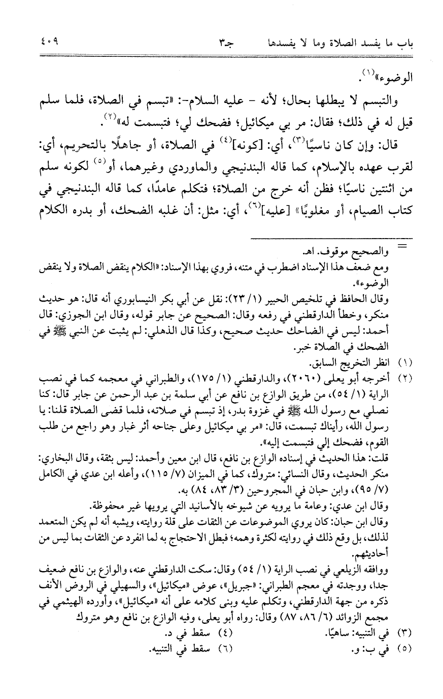 والتبسم لا يبطلها بحال؛ لأنه -عليه السلام-: "تبسم في الصلاة، فلما سلم قيل له في ذلك؛ فقال: مر بي ميكائيل؛ فضحك لي؛ فتبسمت له".