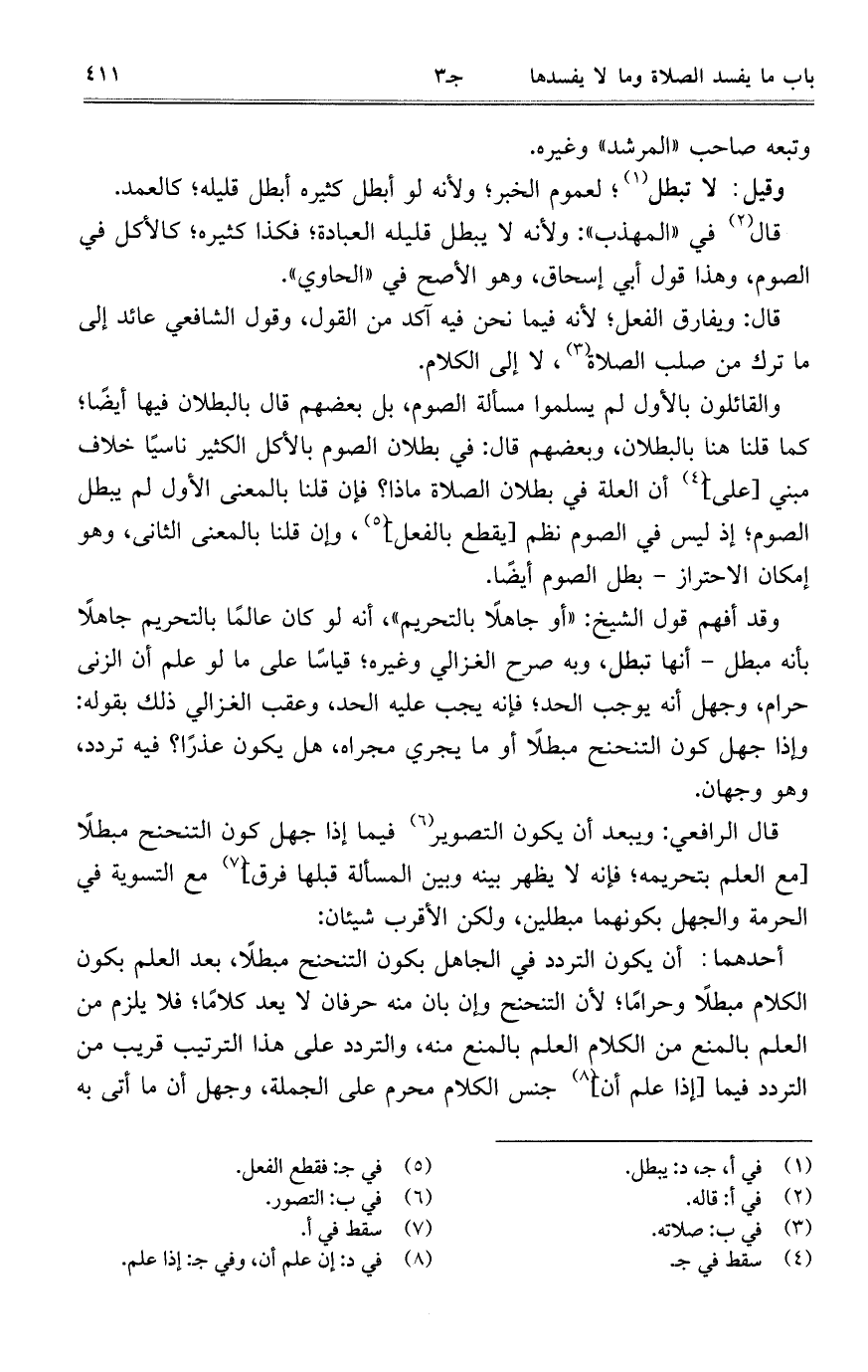 وقد أفهم قول الشيخ: "أو جاهلاً بالتحريم"، أنه لو كان عالماً بالتحريم جاهلاً بأنه مبطل- أنها تبطل، وبه صرح الغزالي وغيره؛ قياساً على ما لو علم أن الزنى حرام، وجهل أنه يوجب الحد؛ فإنه يجب عليه الحد، وعقب الغزالي ذلك بقوله: وإذا جهل كون التنحنح مبطلاً أو ما يجري مجراه، هل يكون عذراً؟ فيه تردد، وهو وجهان.