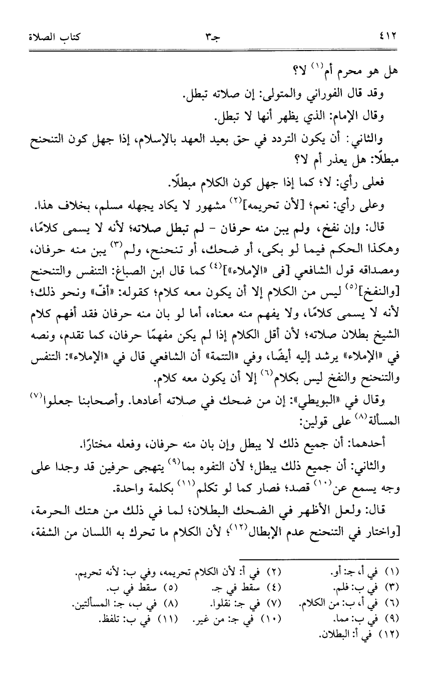 قال: وإن نفخ، ولم يبن منه حرفان-لم تبطل صلاته؛ لأنه لا يسمى كلاماً، وهكذا الحكم فيما لو بكى، أو ضحك، أو تنحنح، ولم يبن منه حرفنا، ومصداقه قول الشافعي [في "الإملاء"] كما قال ابن الصباغ: التنس والتنحنح [والنفخ] ليس من الكلام إلا أن يكون معه كلام؛ كقوله: "أفّ" ونحوذ لك؛ لأنه لا يسمى كلاماً، ولا يفهم منه معناه، أما لو بان منه حرفان فقد أفهم كلام الشيخ بطلان صلاته؛ لأن أقل الكلام إذا لم يكن مفهماً حرفان، كما تقدم، ونصه في "الإملاء" يرشد إليه أيضاً، وفي "التتمة" أن الشافعي قال في "الإملاء": التنفس والتنحنح والنفخ ليس بكلام إلا أن يكون معه كلام.