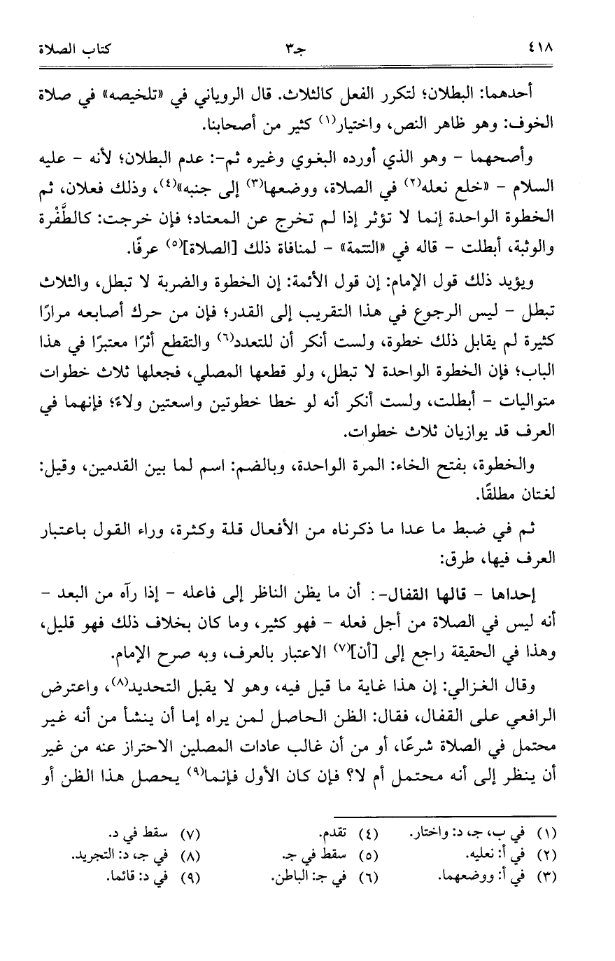 وقال الغزالي: إن هذا غاية ما قيل فيه، وهو لا يقبل التحديد، واعترض الرافعي على القفال، فقال: الظن الحاصل لمن يراه إما أن ينشأ من أنه غير محتمل في الصلاة شرعاً، أو من ان غالب عادات المصلين الاحتراز عنه عن غير أن ينظر إلى أنه محتمل أم لا؟ فإن كان الأول فإنما يحصل هذا الظن أو