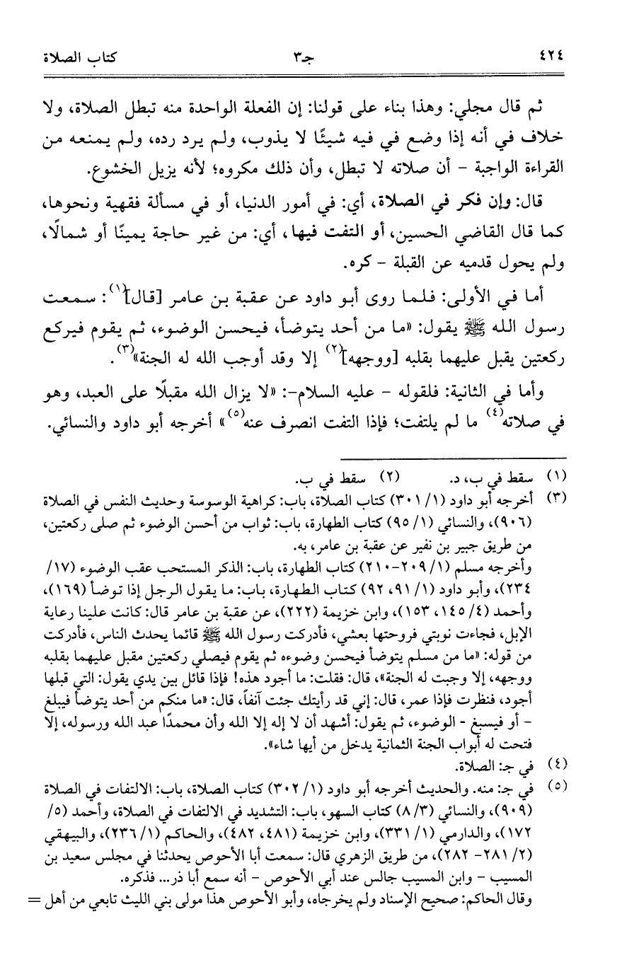 وأما في الثانية: فلقوله-عليه السلام-: "لا يزال الله مقبلاً على العبد، وهو في صلاته ما لم يلتفت؛ فإذا التفت انصرف عنه" أخرجه أبو داود والنسائي.