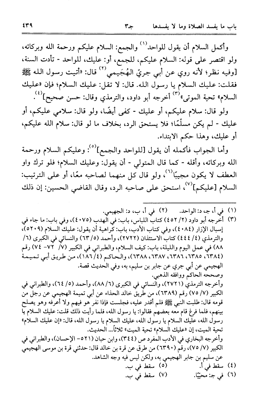 وأكمل السلام أن يقول للواحد والجمع: السلام عليكم ورحمة الله وبركاته، ولو اقتصر علىقوله: السلام عليكم، للجمع، أو: عليك، للواحد- تأدت السنة، [وفيه نظر؛ لأنه روي عن أبي جري الهُجَيمي قال: "أتيت رسول الله صلى الله عليه وسلم فقلت: عليك السلام يا رسول الله. قال: لا تقل: عليك السلام؛ فإن "عليك السلام" تحية الموتى" أخرجه أبو داود، والترمذي وقال: حسن صحيح].
