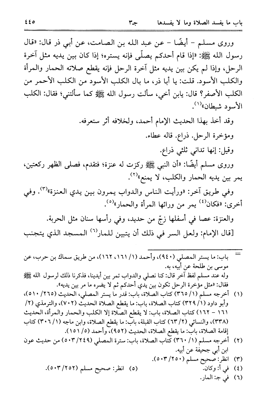 وروى مسلم-أيضاً-عن عبد الله بن الصامت، عن أبي ذر قال: "قال رسول الله صلى الله عليه وسلم: "إذا قام أحدكم يصلي فإنه يستره؛ إذا كانبين يديه مثل آخرة الرحل، وإذا لم يكن بين يديه مثل آخرة الرحل فإنه يقطع صلاته الحمار والمرأة والكلب الأسود. قلت: يا أبا ذر، ما بال الكلب الأسود من الكلب الأحمر من الكلب الأصفر؟ قال: يا بن أخي، سألت رسولا لله صلى الله عليه وسلم كما سألتني؛ فقال: الكلب الأسود شيطان".