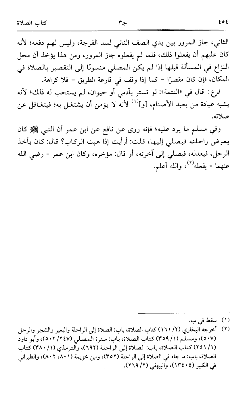 وفي مسلم ما يرد عليه؛ فإنه روى عن نافع عن ابن عمر أن النبي صلى الله عليه وسلم كان يعرض راحلته فيصلي إليها، قلت: أرأيت إذا هبت الركاب؟ قال: كان يأخذ الرحل، فيعدله، فيصلي إلى آخرته، أو قال: مؤخره، وكان ابن عمر -رضي الله عنهما- يفعله، والله أعلم.