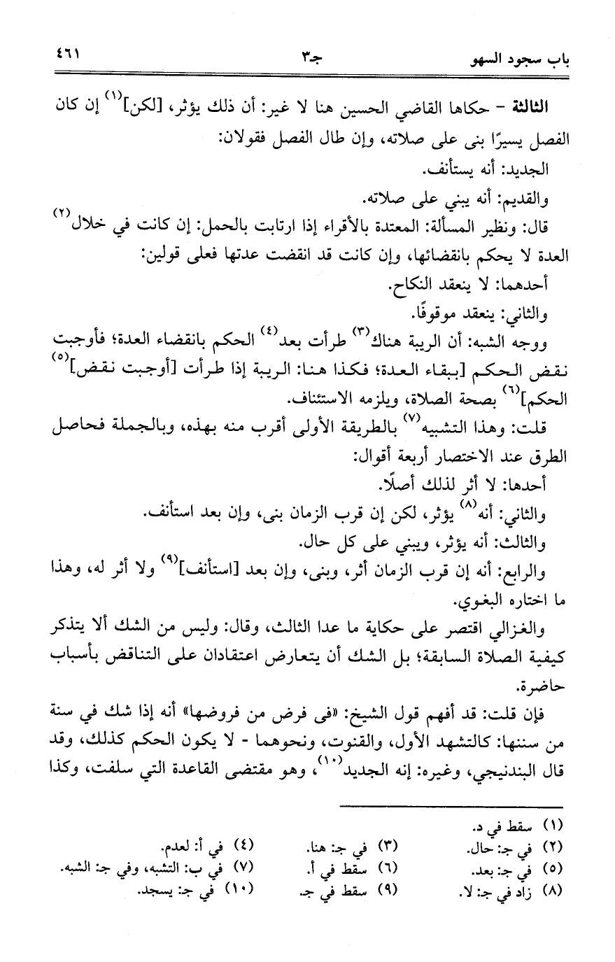 فن قلت: قد أفهم قول الشيخ: "في فرض من فروضها" أنه إذا شك في سنة من سننها: كالتشهد الأول، والقنوت، ونحوهما-لا يكون الحكم كذلك، وقد قال البندنيجي، وغيره: إنه الجديد، وهو مقتضى القاعدة التي سلفت، وكذا