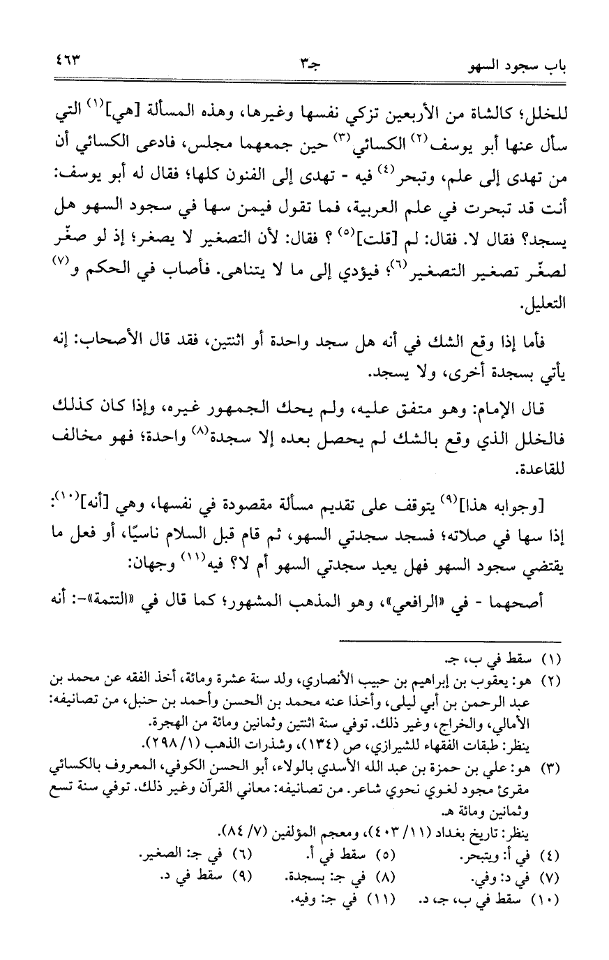 للخلل؛ كالشاة من الأربعين تزكي نفسها وغيرها، وهذه المسألة [هي] التي سأل عنها أبو يوسف الكسائي حين جمعهما مجلس، فادعى الكسائي أن من تهدي إلى علم، وتبحر فيه- تهدى إلى الفنون كلها؛ فقال له أبو يوسف: أنت قد تبحرت في علم العربية، فما تقول فيمن سها في سجود السهو هل يسجد؟ فقال لا. فقال: لم [قلت]؟ فقال: لأن التصغير لا يصغر؛ إذ لو صغر لصغر تصغير التصغير؛ فيؤدي إلى ما لا يتناهى. فأصاب في الحكم والتعليل.