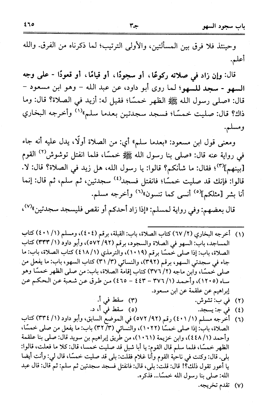 ومعنى قول ابن مسعود: "بعدما سلم" أي: من الصلاة أولاً، يدل عليه أنه جاء في رواية عنه قال: "صلى بنا رسول الله صلى الله عليه وسلم خمساً، فلما انفتل توشوش القوم [بينهم]؛ فقال: ما شأنكم؟ قالوا: يا رسول الله، هل زيد في الصلاة؟ قال: لا. قالوا: فإنك قد صليت خمساً؛ فانفتل فسجد سجدتين، ثم سلم، ثم قال: إنما أنا بشر [مثلكم] أنسى كما تنسون" وأخرجه مسلم.