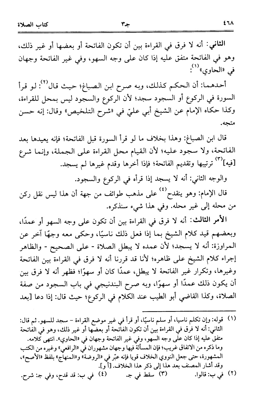 الأمر الثالث: أنه لا فرق في القراءة بين أن تكون علىوجه السهو أو عمداً، وبعضهم قيد كلام الشيخ بما إذا فعل ذلك ناسياً، وحكى معه وجهاً آخر عن المراوزة: أنه لا يسجد؛ لأن عمده لا يبطل الصلاة-على الصحيح-والظاهر إجراء كلام الشيخ على ظاهره؛ لأنا قد قررنا أنه لا فرق في القراءة بين الفاتحة وغيرها، وتكرار غير الفاتحة لا يبطل، عمداً كان أو سهواً؛ فظهر أنه لا فرق بين أن يكون ذلك عمداً أو سهواً، وبه صرح البندنيجي في باب السجود من صفة الصلاة، وكذا القاضي أبو الطيب عند الكلام في الركوع؛ حيث قال: إذا دعا [بعد