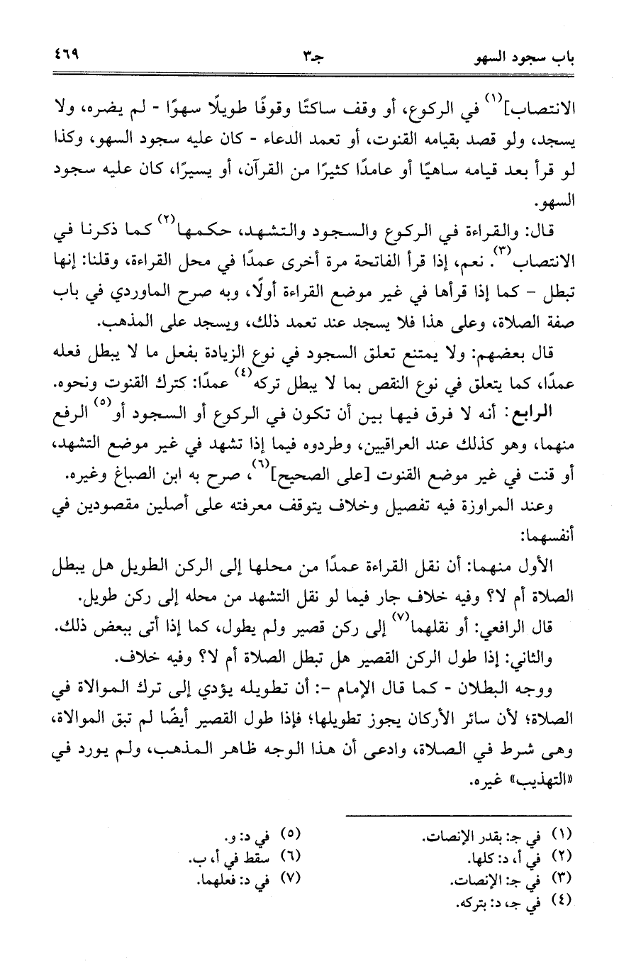 الانتصاب] في الركوع، أو وقف ساكتاً وقواً طويلاً سهواً-لم يضره، ولا يسجد، ولو قصدبقيامه القنوت، أو تعمد الدعاء- كان عليه سجود السهو، وكذا لو قرأ بعد قيامه ساهياً أو عامداً كثيراً من القرآن، أو يسيراً، كان عليه سجود السهو.