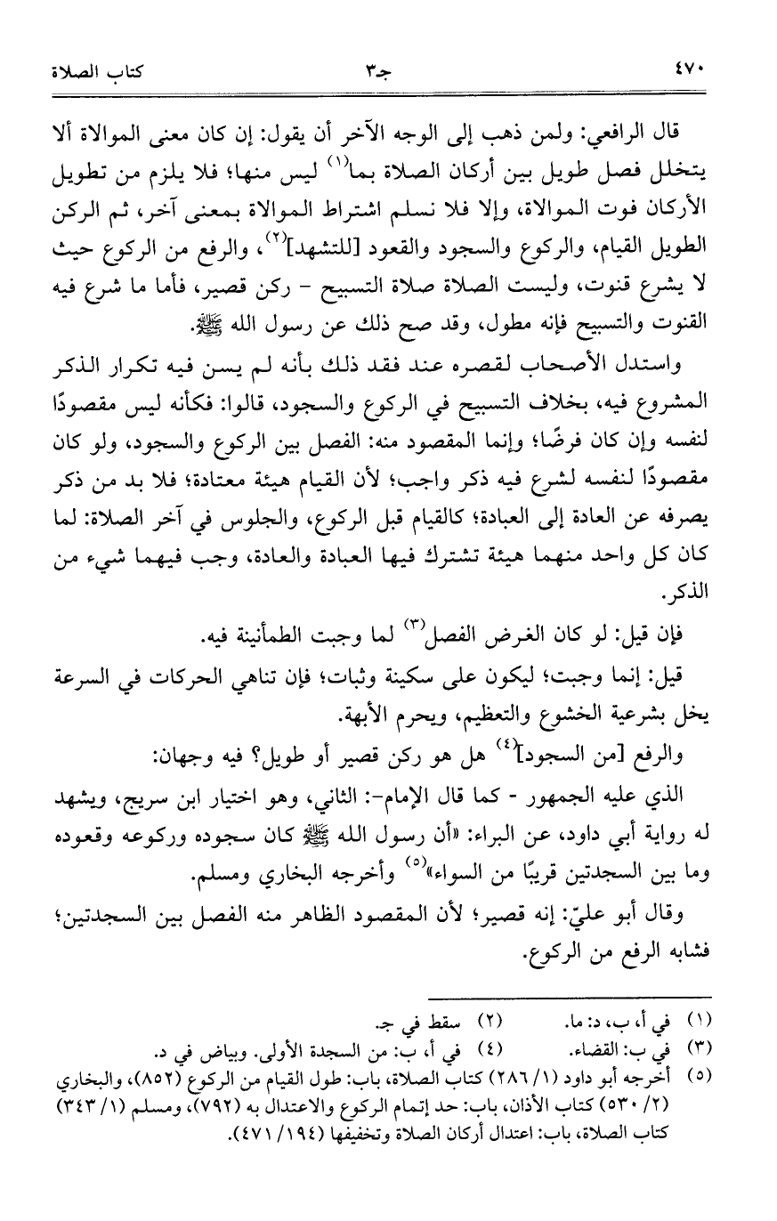 قال الرافعي: ولمن ذهب إلى الوجه الآخر أن يقول: إن كان معنى الموالاة ألا يتخلل فصل طويل بين أركان الصلاة بما ليس منها؛ فلا يلزم من تطويل الأركان فوت الموالاة، وألا فلا نسلم اشتراط الموالاة بمعنى آخر، ثم الركن الطويل القيام، والركوع والسجود والقعود [للتشهد]، والرفع من الركوع حيث لا يشرع قنوت، وليست الصلاة صلاة التسبيح-ركن قصير، فأما ما شرع يه القنوت والتسبيح فإنه مطول، وقد صح ذلك عن رسول الله صلى الله عليه وسلم.