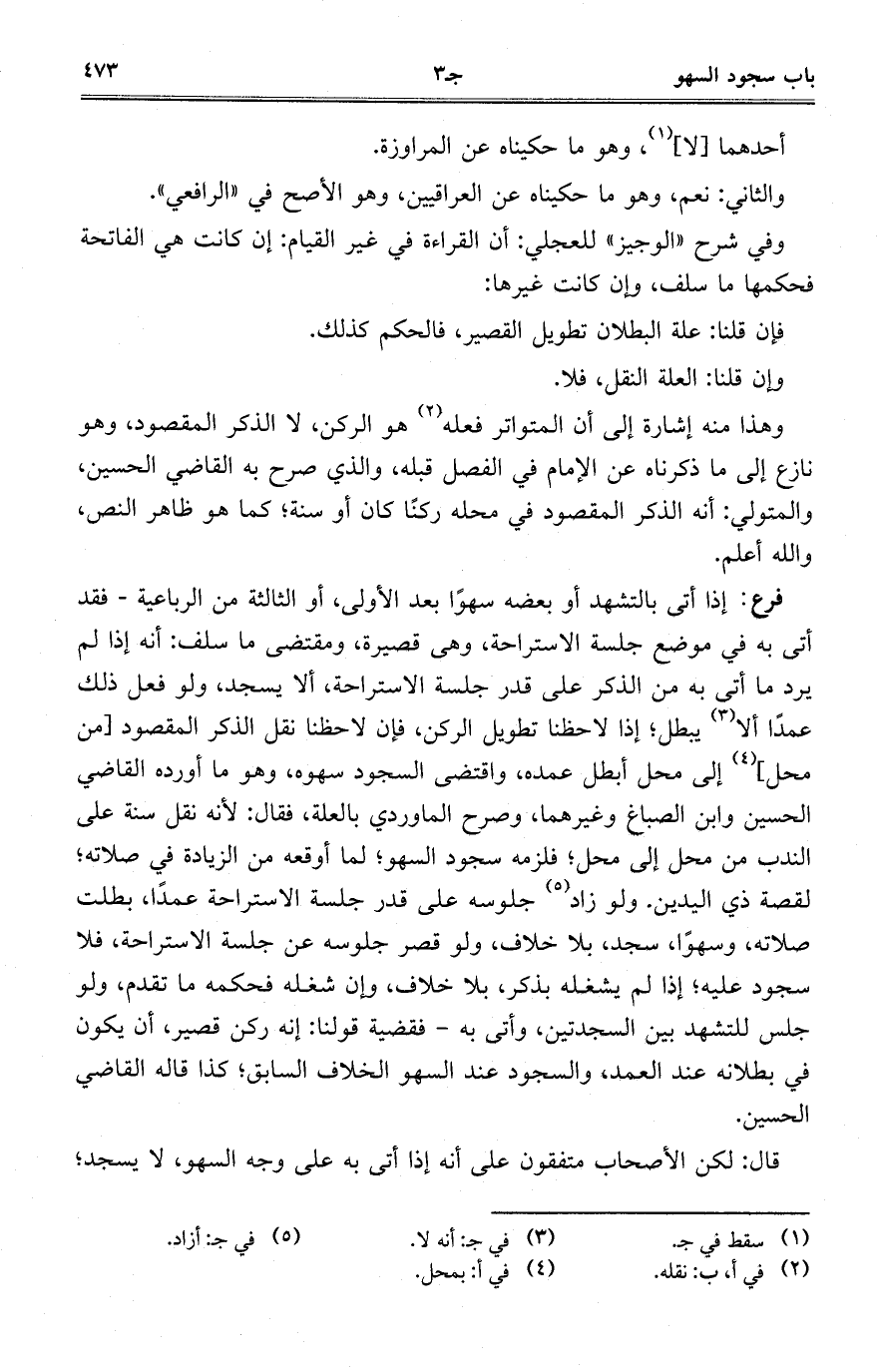 فرع: إذا أتى بالتشهد أو بعضه سهواً بعد الأولى، أو الثالثة من الرباعية-فقد أتى به في موضع جلسة الاستراحة، وهي قصيرة، ومقتضى ما سلف: أنه إذا لم يرد ما أتى به من الذكر على قدر جلسة الاستراحة، ألا يسجد، ولو فعل ذلك عمداً ألا يبطل؛ إذا لاحظنا تطويل الركن، فإن لاحظنا نقل الذكر المقصود [من محل] إلى محل أبطل عمده، واقتضى السجود سهوه، وهو ما أورده القاضي الحسين وابن الصباغ وغيرهما، وصرح الماوردي بالعلة، فقال: لأنه نقل سنة على الندب من محل إلى محل؛ فلزمه سجود السهو؛ لما أوقعه من الزيادة في صلاته؛ لقصة ذي اليدين. ولو زاد جلوسه على قدر جلسة الاستراحة عمداً، بطلت صلاته، وسهواً، سجد، بلا خلاف، ولو قصر جلوسه عن جلسة الاستراحة، فلا سجود عليه؛ إذا لم يشغله بذكر، بلا خلاف، وإن شغله فحكمه ما تقدم، ولو جلس للتشهد بسن السجدتين، وأتى به-فقضية قولنا: إنه ركن قصير، أن يكون في بطلانه عند العمد، والسجود عند السهو الخلاف السابق؛ كذا قاله القاضي الحسين.
