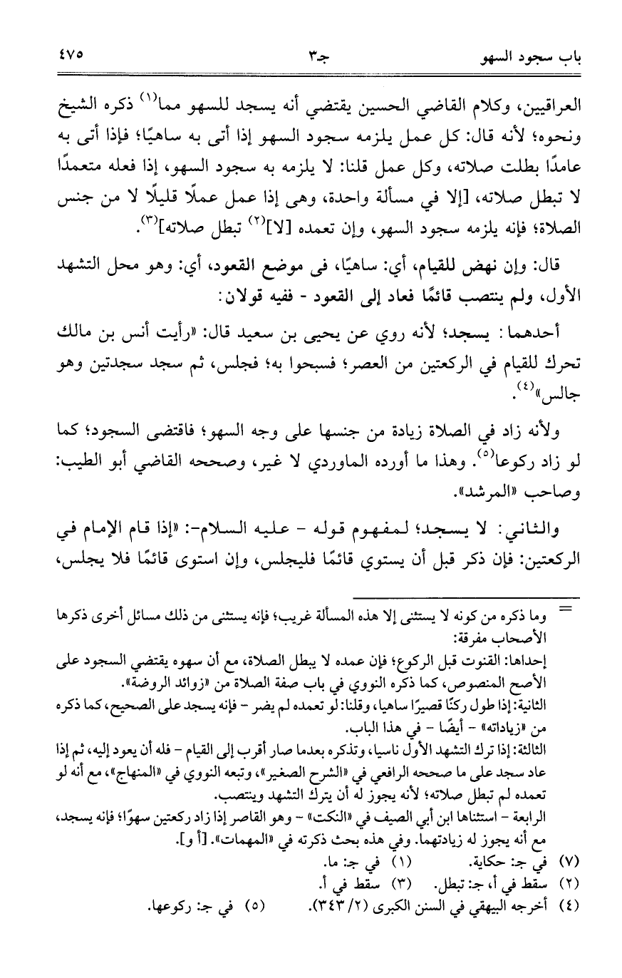 العراقيين، وكلام القاضي الحسين يقتضي أنه يسجد للسهو مما ذكره الشيخ ونحوه؛ لأنه قال: كل عمل يلزمه سجود السهو إذا أتى به ساهياً؛ فإذا أتى به عامداً بطلت صلاته، وكل عمل قلنا: لا يلزمه به سجود السهو، إذا فعله متعمداً لا تبطل صلاته، [إلا في مسألة واحدة، وهي إذا عمل عملاً قليلاً لا من جنس الصلاة؛ فإنه يلزمه سجود السهو، وإن تعمده [لا] تبطل صلاته].