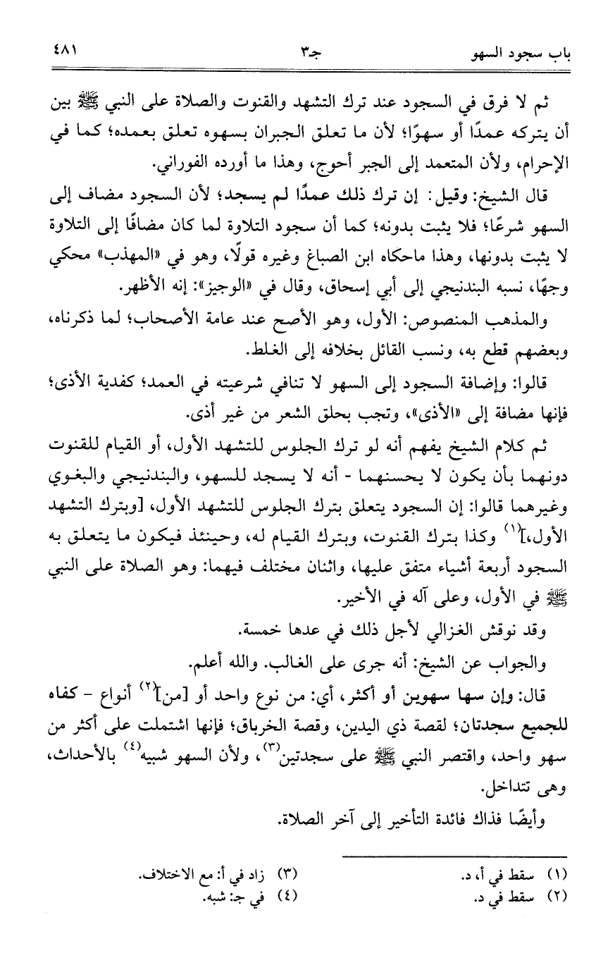 ثم كلام الشيخ يفهم أنه لو ترك الجلوس للتشهد الأول، أو القيام للقنوت دونهما بأن يكون لا يحسنهما- أنه لا يسجد للسهو، والبندنيجي والبغوي وغيرهما قالوا: إن السجود يتعلق بترك الجلوس للتشهد الأولن [وبترك التشهد الأول]، وكذا بترك القنوت، وبترك القيام له، وحينئذ فيكون ما يتعلق به السجود أربعة أشياء متفق عليها، واثنان مختلف فيهما: وهو الصلاة على النبي صلى الله عليه وسلم في الأول، وعلى آله في الأخير.