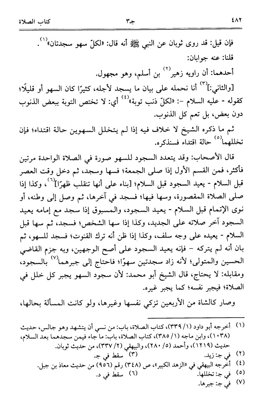 [والثاني:] أنا نحمله على بيان ما يسجد لأجله، كثيراً كان السهو أو قليلاً؛ كقوله-عليه السلام-:"لكل ذنب توبة" أي: لا تختص التوبة ببعض الذنوب دون بعض، بل تعم كل الذنوب.