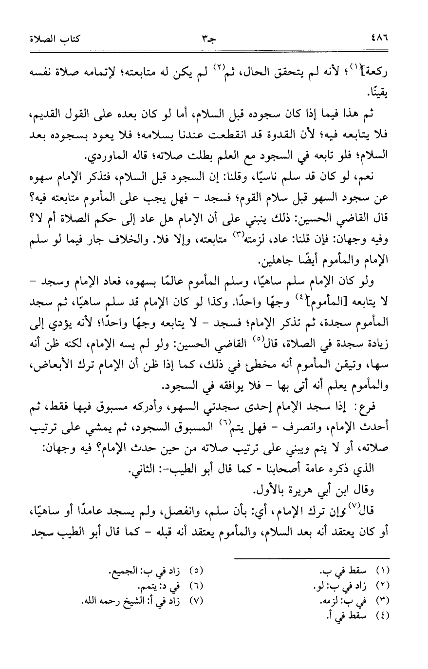 نعم، لو كانقد سلم ناسياً، وقلنا: إن السجود قبل السلما، فتذكر الإمام سهوه عن سجود السهو قبل سلام القوم؛ فسجد- فهل يجب على المأموم متابعته فيه؟ قال القاضي الحسين: ذلك ينبني على أن الإمام هل عاد إلى حكم الصلاة أم لا؟ وفيه وجهان: فإن قلنا: عاد، لزمته متابعته، وألا فلا. والخلاف جار فيما لو سل الإمام والمأموم أيضاً جاهلين.