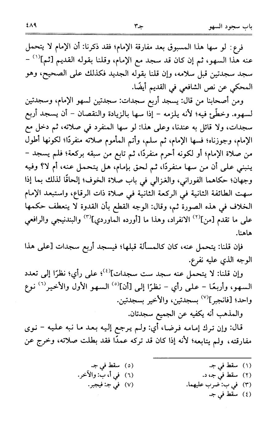 ومن أصحابنا من قال: يسجد أربع سجدات: سجدتين لسهو الإمام، وسجدتين لسهوه. وخطئ فيه؛ لأنه يلزمه-إذا سها بالزيادة والنقصان- أن يسجد أربع سجدات، ولا قائل به عندنا، وعلى هذا: لو سها المنفرد في صلاته، ثم دخل مع الإمام، وجوزناه؛ فسا الإمام، ثم سلم، وأتم المأموم صلاته منفرداً؛ لكونها أطول من صلاة الإمام؛ أو لكونه أحرم منفرداًن ثم تابع من سبقه بركعة؛ فلم يسجد- ينبني على أن من سها منفرداً، ثم لحق بإمام، هل يتحمل عنه، أم لا؟ وفيه وجهان؛ حكاهما الفوراني، والغزالي في باب صلاة الخوف؛ إلحاقاً لذلك بما إذا سهت الاطئفة الثانية في الركعة الثانية في صلاة ذات الرقاع، واستبعد الإمام الخلاف في هذه الصورة ثم، وقال: الوجه القطع بأن القدوة لا ينعطف حكمها على ما تقدم [من] الانفراد، وهذا ما [أورده الماوردي] والبندنيجي والرافعي هاهنا.