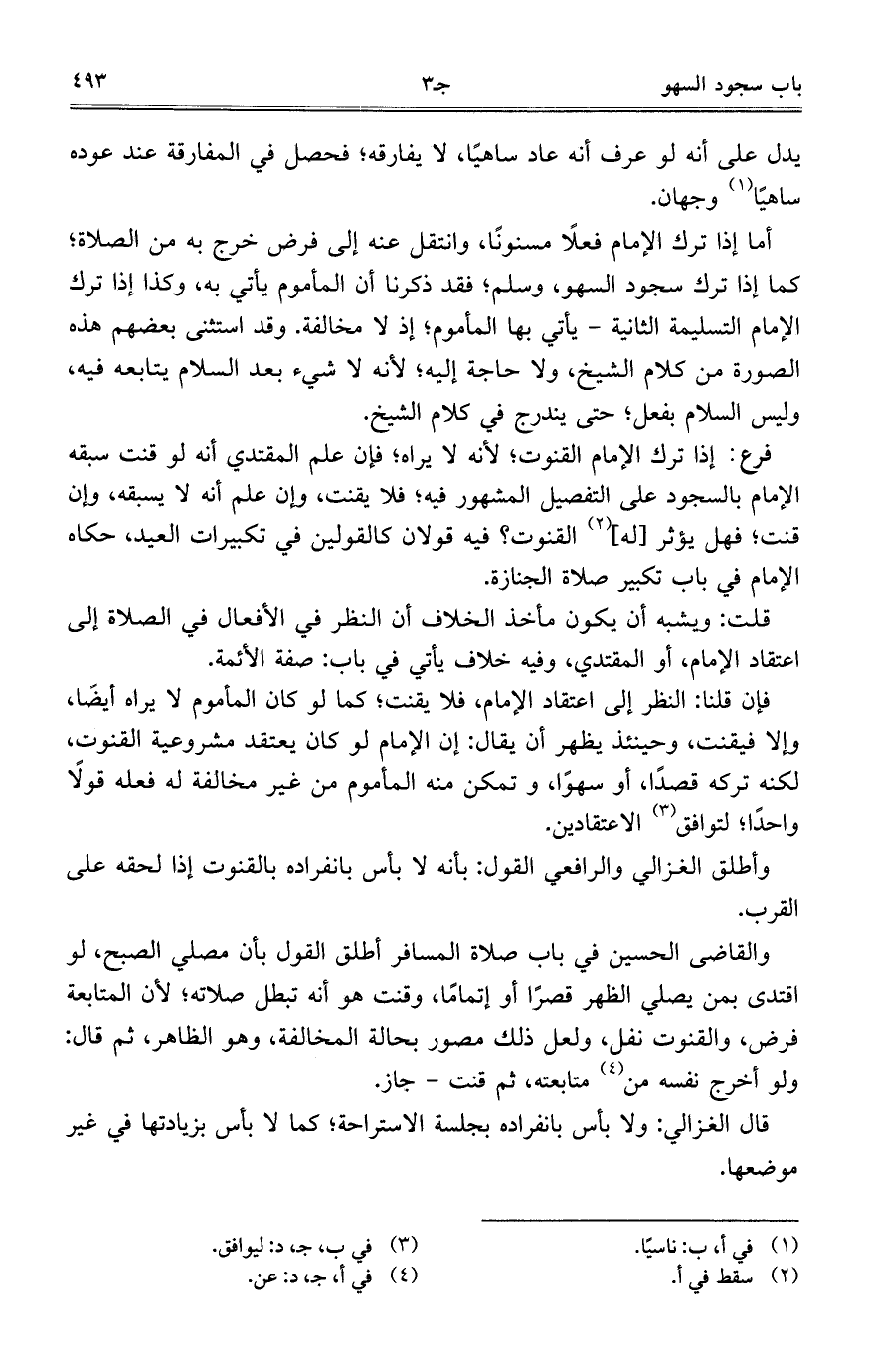 أما إذا ترك الإمام فعلاً مسنوناً، وانتقل عنه إلى فرض خرج به من الصلاة؛ كما إذا ترك سجود السهو، وسلم؛ فقد ذكرنا أن المأموم يأتي به، وكذا إذا ترك افمام التسليمة الثانية- يأتي بها المأموم؛ إذ لا مخالفة. وقد استثنى بعضهم هذه الصورة من كلام الشيخ، ولا حاجة إليه؛ لأنه لا شيء بعد السلام يتابعه فيه، وليس السلام بفعل؛ حتى يندرج في كلام الشيخ.